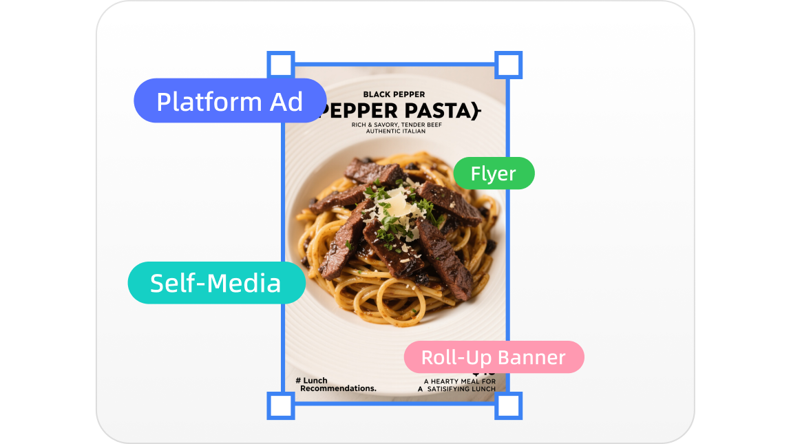 The system supports precise adaptation and flexible reuse of materials. Content and dimensions are automatically adjusted to match the requirements of various social media platforms based on holidays, new product launches, or promotional plans. Additionally, merchants can precisely edit specific elements like prices or dish names, allowing a single set of materials to be reused across multiple scenarios.