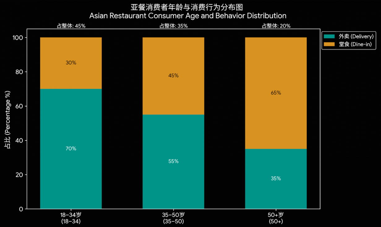 18–34 years old: Represents 45% of total; 70% delivery, 30% dine-in.