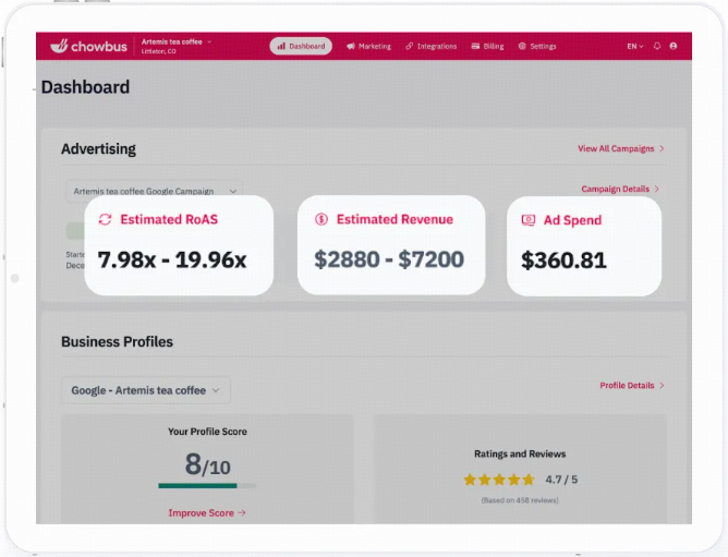 Chowbus AI Digital Marketing 不只是投流工具,更是为北美餐饮老板量身定制的全链路营销方案,自己就能做 Google 精准投流,牢牢抓住本地客流,让自营订单越涨越多!